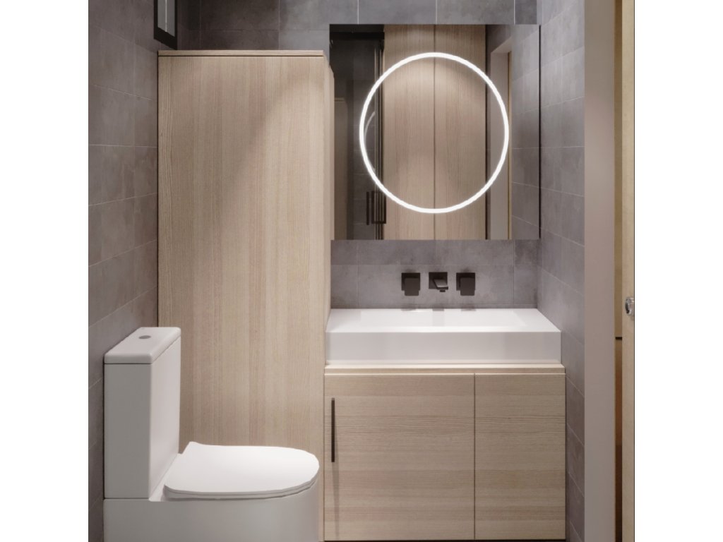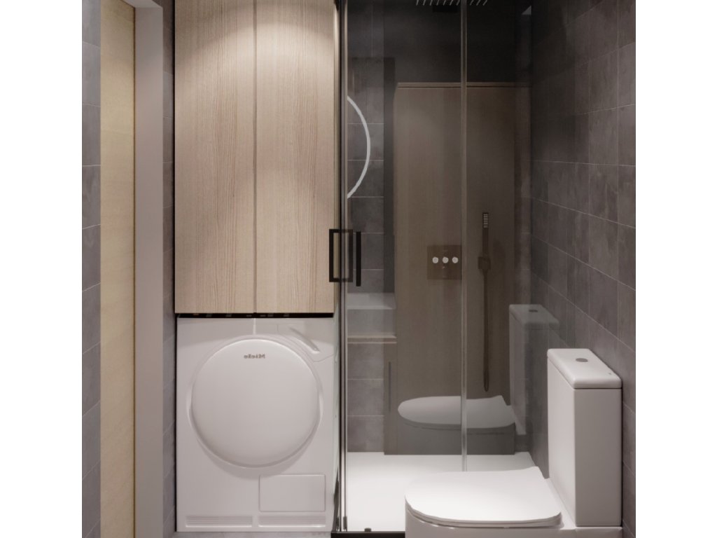 Vybavení koupelny: obklady stěn SPC s různým vzorem + sprchový kout + umyvadlo + baterie + WC + SPC podlaha + koupelnová skříňka